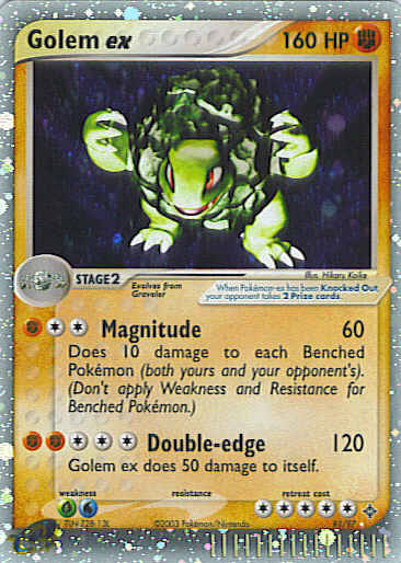 | Type | Fighting | | Pokemon serie | Dragon | | Stadie | Stage 2 | | HP | 160 | | Sjældenhed | Ultra-Rare | | Tilbagetrækning | 5 | | Svaghed | GW | | Kortnummer | 91 | | Evne | [CCF] Magnitude (60) Does 10 damage to each Benched Pokemon (both yours and your opponent's). (Don't apply Weakness and Resistance for Benched Pokemon.) [CCCFF] Double-edge (120) Golem ex does 50 damage to itself. | | Evne2 | [CCF] Magnitude (60) Does 10 damage to each Benched Pokemon (both yours and your opponent's). (Don't apply Weakness and Resistance for Benched Pokemon.) [CCCFF] Double-edge (120) Golem ex does 50 damage to itself. | | Kunstner | Hikaru Koike |
