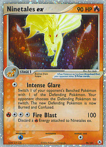 | Type | Fire | | Pokemon serie | Hidden Legends | | Stadie | Stage 1 | | HP | 90 | | Sjældenhed | Ultra-Rare | | Tilbagetrækning | 1 | | Svaghed | W | | Kortnummer | 96 | | Evne | [C] Intense Glare - Switch 1 of your opponent's Benched Pokemon with 1 of the Defending Pokemon. Your opponent chooses the Defending Pokemon to switch. The new Defending Pokemon is now Burned and Confused. [CCCR] Fire Blast (100) Discard a R Energy attached to Ninetales ex. | | Evne2 | [C] Intense Glare - Switch 1 of your opponent's Benched Pokemon with 1 of the Defending Pokemon. Your opponent chooses the Defending Pokemon to switch. The new Defending Pokemon is now Burned and Confused. [CCCR] Fire Blast (100) Discard a R Energy attached to Ninetales ex. | | Kunstner | Ryo Ueda |