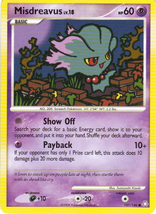 | Type | Psychic | | Pokemon serie | Legends Awakened | | Stadie | Basic | | HP | 60.0 | | Sjældenhed | Common | | Tilbagetrækning | 1.0 | | Modstand | C-20 | | Svaghed | D+10 | | Kortnummer | 107 | | Evne |
