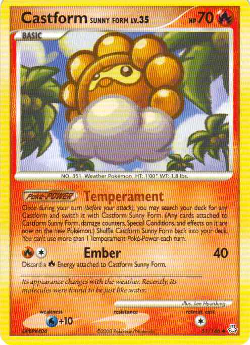| | Evne2 | on it are now on the new Pokemon.) Shuffle Castform Sunny Form back into your deck. You can't use more than 1 Temperament Poke-Power each turn. (Poke-POWER)