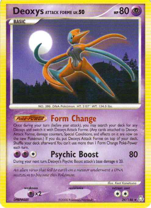 | Type | Psychic | | Pokemon serie | Legends Awakened | | Stadie | Basic | | HP | 80.0 | | Sjældenhed | Rare | | Tilbagetrækning | 2.0 | | Svaghed | Px2 | | Kortnummer | 24 | | Evne | on it are now on the new Pokemon.) If you do, put Deoxys Normal Forme on top of your deck. Shuffle your deck afterward. You can't use more than 1 Form Change Poke-Power each turn. (Poke-POWER)