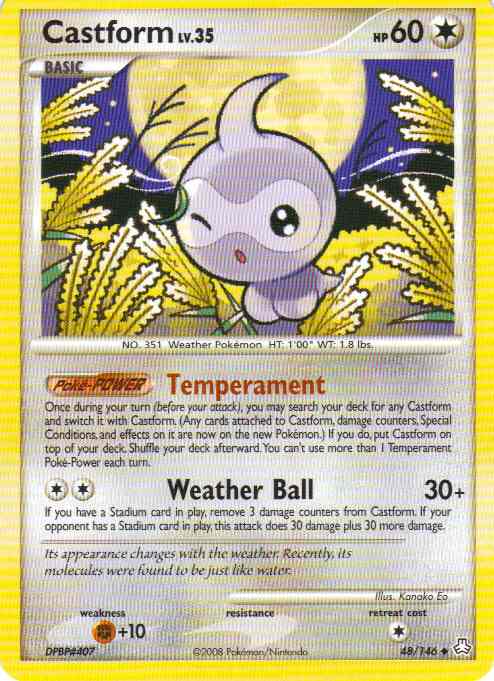 | Type | Colorless | | Pokemon serie | Legends Awakened | | Stadie | Basic | | HP | 60.0 | | Sjældenhed | Uncommon | | Tilbagetrækning | 1.0 | | Svaghed | F+10 | | Kortnummer | 48 | | Evne | on it are now on the new Pokemon.) If you do, put Castform on top of your deck. Shuffle your deck afterward. You can't use more than 1 Temperament Poke-Power each turn. (Poke-POWER)