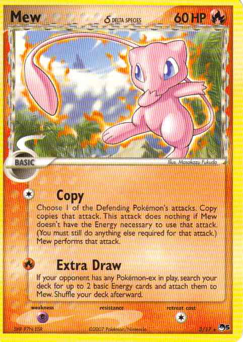 | | Evne2 | [C] Copy - Choose 1 of the Defending Pokemon's attacks. Copy copies that attack. This attack does nothing if Mew doesn't have the Energy necessary to use that attack. (You must still do anything else required for that attack.) Mew performs that attack. [R] Extra Draw - If your opponent has any Pokemon-ex in play, search your deck for up to 2 basic Energy cards and attach them to Mew. Shuffle your deck afterward.