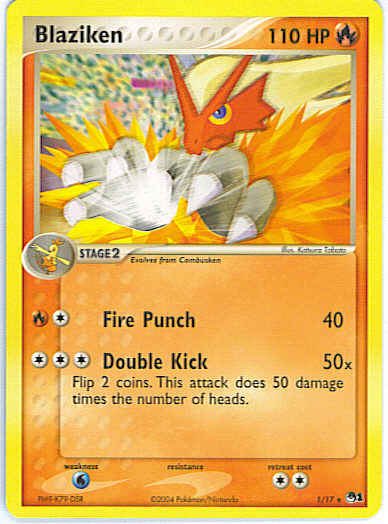 | Type | Fire | | Pokemon serie | OP Series 1 | | Stadie | Stage 2 | | HP | 110 | | Sjældenhed | Rare | | Tilbagetrækning | 2 | | Svaghed | W | | Kortnummer | 1 | | Evne | [CR] Fire Punch (40) [CCC] Double Kick (50x) Flip 2 coins. This attack does 50 damage times the number of heads.