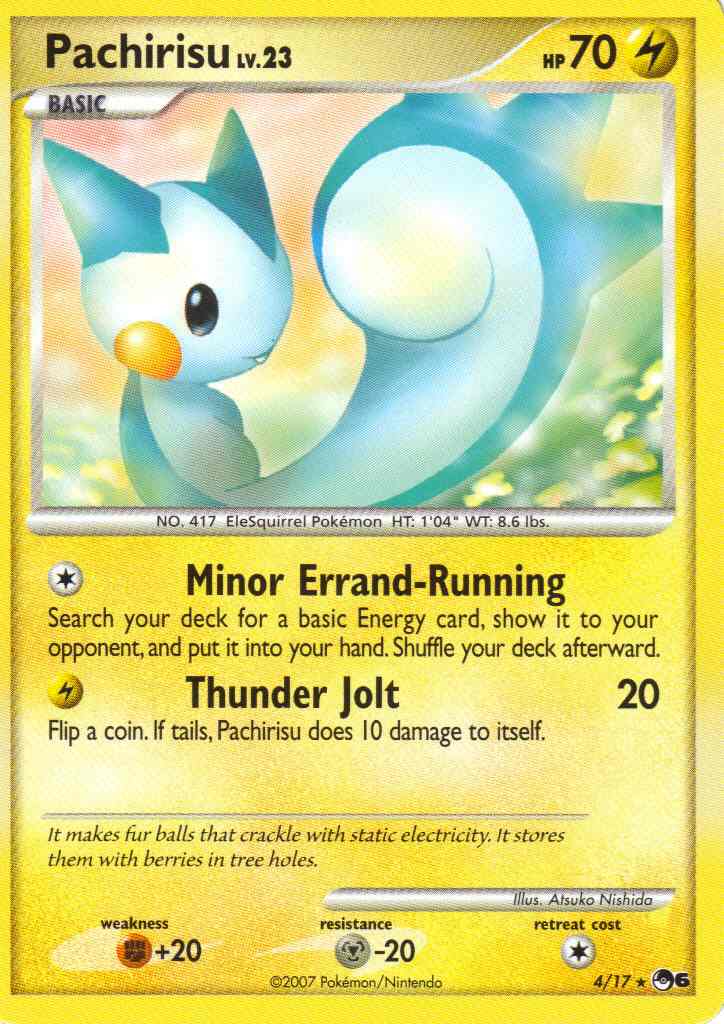 | | Evne2 | [C] Minor Errand-Running - Search your deck for a basic Energy card, show it to your opponent, and put it into your hand. Shuffle your deck afterward. [L] Thunder Jolt (20) Flip a coin. If tails, Pachirisu does 10 damage to itself.