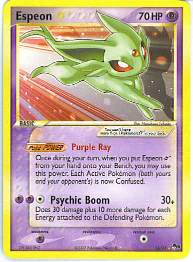 | Type | Psychic | | Pokemon serie | OP Series 5 | | Stadie | Basic | | HP | 70 | | Sjældenhed | Ultra-Rare | | Tilbagetrækning | 1 | | Svaghed | P | | Kortnummer | 16 | | Evne | [CPP] Psychic Boom (30+) Does 30 damage plus 10 more damage for each Energy attached to the Defending Pokemon.