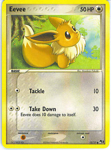 | Type | Colorless | | Pokemon serie | OP Series 3 | | Stadie | Basic | | HP | 50 | | Sjældenhed | Common | | Tilbagetrækning | 1 | | Svaghed | F | | Kortnummer | 13 | | Evne | [C] Tackle (10) [CC] Take Down (30) Eevee does 10 damage to itself.