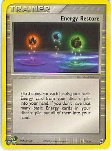 Flip 3 coins. For each heads, put a basic Energy card from your discard pile into your hand. If you don't have that many basic Energy cards in your discard pile, put all of them into your hand.