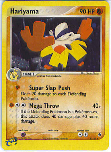 | Type | Fighting | | Pokemon serie | Ruby Sapphire | | Stadie | Stage 1 | | HP | 90 | | Sjældenhed | Rare | | Tilbagetrækning | 2 | | Svaghed | P | | Kortnummer | 8 | | Evne | [F] Super Slap Push - Does 20 damage to each Defending Pokemon. [CCF] Mega Throw (40+) If the Defending Pokemon is a Pokemon-ex, this attack does 40 damage plus 40 more damage.