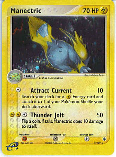 | Type | Lightning | | Pokemon serie | Ruby Sapphire | | Stadie | Stage 1 | | HP | 70 | | Sjældenhed | Rare | | Tilbagetrækning | 1 | | Modstand | M | | Svaghed | F | | Kortnummer | 9 | | Evne | [C] Attract Current (10) Search your deck for a L Energy card and attach it to 1 of your Pokemon. Shuffle your deck afterward. [CLL] Thunder jolt (50) Flip a coin. If tails, Manectric does 10 damage to itself.