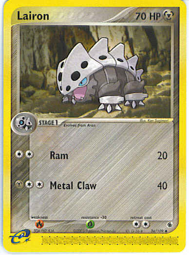 | Type | Metal | | Pokemon serie | Ruby Sapphire | | Stadie | Stage 1 | | HP | 70 | | Sjældenhed | Uncommon | | Tilbagetrækning | 2 | | Modstand | G | | Svaghed | R | | Kortnummer | 36 | | Evne | [CC] Ram (20) [CCM] Metal Claw (40)