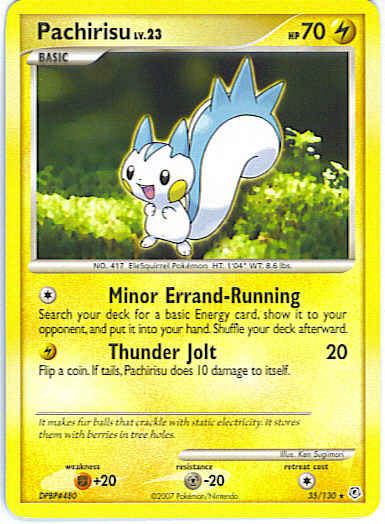 | | Evne2 | [C] Minor Errand-Running - Search your deck for a basic Energy card, show it to your opponent, and put it into your hand. Shuffle your deck afterward. [L] Thunder Jolt (20) Flip a coin. If tails, Pachirisu does 10 damage to itself.