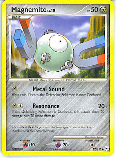 | Type | Metal | | Pokemon serie | Diamond and Pearl | | Stadie | Basic | | HP | 50 | | Sjældenhed | Common | | Tilbagetrækning | 1 | | Modstand | P-20 | | Svaghed | R+10 | | Kortnummer | 87 | | Evne |