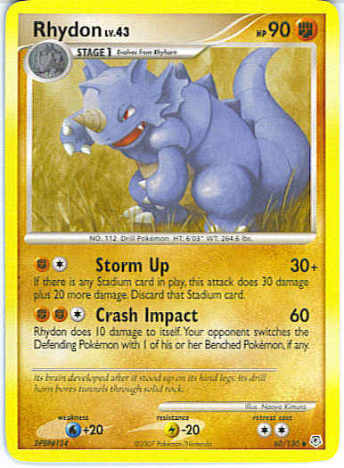 [CFF] Crash Impact (60) Rhydon does 10 damage to itself. You opponent switches the Defending Pokemon with 1 of his or her Benched Pokemon, if any.