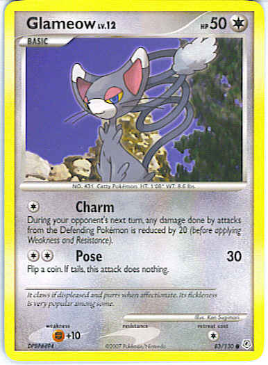 | Type | Colorless | | Pokemon serie | Diamond and Pearl | | Stadie | Basic | | HP | 50 | | Sjældenhed | Common | | Tilbagetrækning | 1 | | Svaghed | F+10 | | Kortnummer | 83 | | Evne |