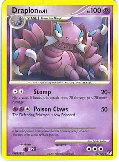 | Type | Psychic | | Pokemon serie | Diamond and Pearl | | Stadie | Stage 1 | | HP | 100 | | Sjældenhed | Rare | | Tilbagetrækning | 3 | | Svaghed | P+20 | | Kortnummer | 23 | | Evne |