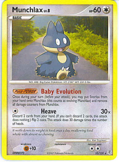 | Type | Colorless | | Pokemon serie | Diamond and Pearl | | Stadie | Basic | | HP | 60 | | Sjældenhed | Rare | | Tilbagetrækning | 2 | | Svaghed | F+10 | | Kortnummer | 33 | | Evne |
