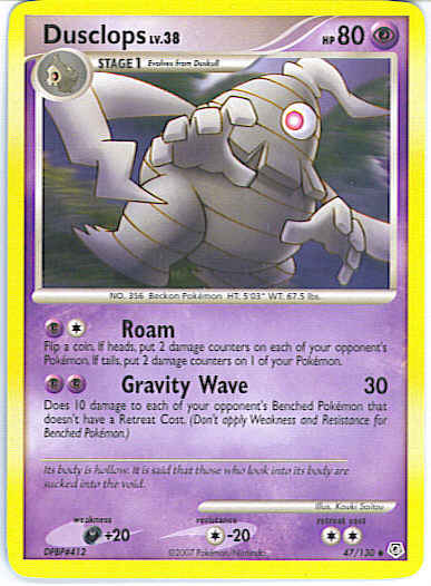 | Type | Psychic | | Pokemon serie | Diamond and Pearl | | Stadie | Stage 1 | | HP | 80 | | Sjældenhed | Uncommon | | Tilbagetrækning | 2 | | Modstand | C-20 | | Svaghed | D+20 | | Kortnummer | 47 | | Evne |