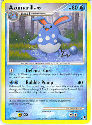 [WW] Bubble Pump (40+) If Azumarill has 3 or more Energy attached to it, this attack does 40 damage plus 20 more damage. If Azurill is anywhere under Azumarill, flip a coin. If heads, the Defending Pokemon is now Paralyzed.