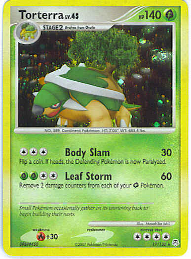 | Type | Grass | | Pokemon serie | Diamond and Pearl | | Stadie | Stage 2 | | HP | 140 | | Sjældenhed | Rare | | Tilbagetrækning | 4 | | Svaghed | R+30 | | Kortnummer | 17 | | Evne |