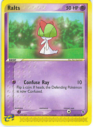 | Type | Psychic | | Pokemon serie | Ruby Sapphire | | Stadie | Basic | | HP | 50 | | Sjældenhed | Common | | Tilbagetrækning | 1 | | Svaghed | P | | Kortnummer | 66 | | Evne | [P] Confuse Ray (10) Flip a coin. If heads, the Defending Pokemon is now Confused.