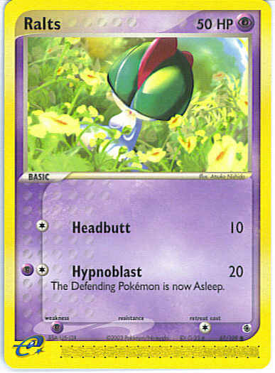 | Type | Psychic | | Pokemon serie | Ruby Sapphire | | Stadie | Basic | | HP | 50 | | Sjældenhed | Common | | Tilbagetrækning | 1 | | Svaghed | P | | Kortnummer | 67 | | Evne | [C] Headbutt (10) [CP] Hypnoblast (20) The Defending Pokemon is now Asleep.