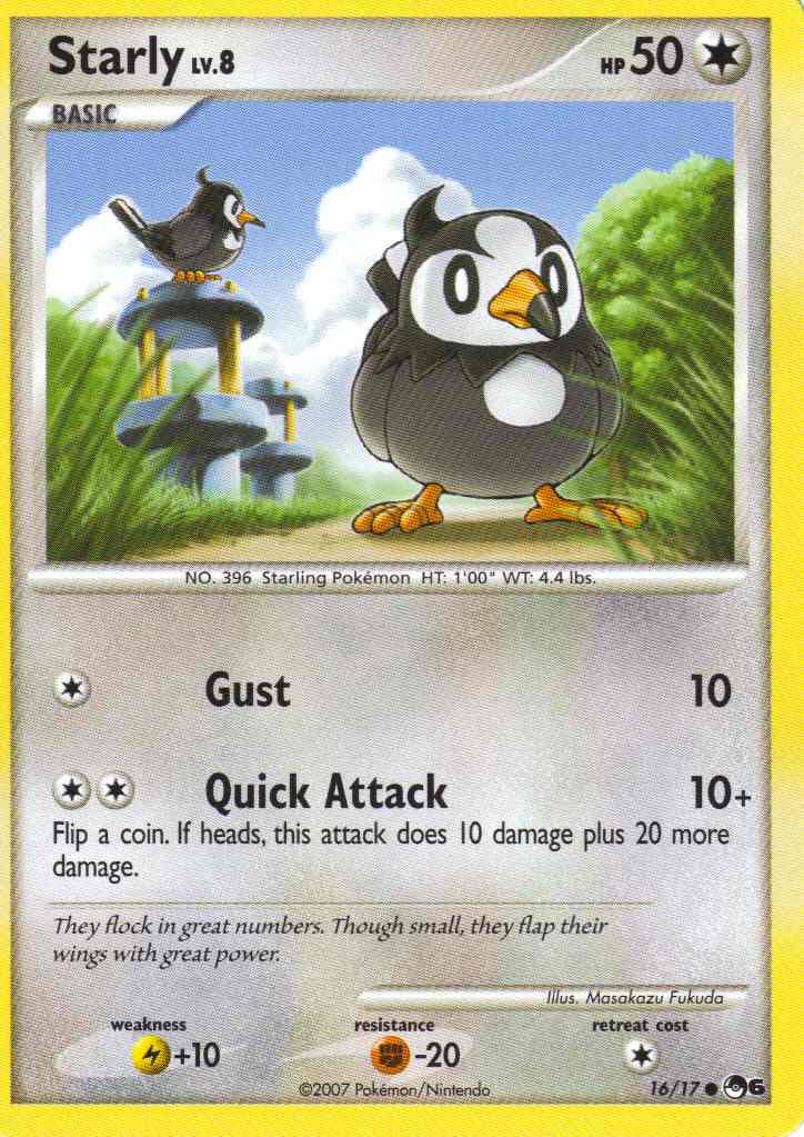 | Type | Colorless | | Pokemon serie | OP Series 6 | | Stadie | Basic | | HP | 50 | | Sjældenhed | Common | | Tilbagetrækning | 1 | | Modstand | F-20 | | Svaghed | L+10 | | Kortnummer | 16 | | Evne | [C] Gust (10) [CC] Quick Attack (10+) Flip a coin. If heads, this attack does 10 damage plus 20 more damage.