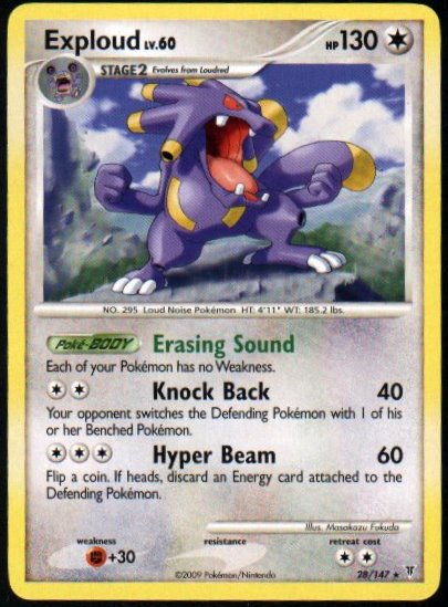 | Type | Colorless | | Pokemon serie | Supreme Victors | | Stadie | Stage 2 | | HP | 130 | | Sjældenhed | Rare | | Tilbagetrækning | 2 | | Svaghed | F+30 | | Kortnummer | 28 | | Evne |