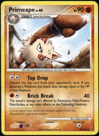 | Type | Fighting | | Pokemon serie | Supreme Victors | | Stadie | Stage 1 | | HP | 90 | | Sjældenhed | Rare | | Tilbagetrækning | 1 | | Modstand | | | Svaghed | P+20 | | Kortnummer | 39 | | Evne |