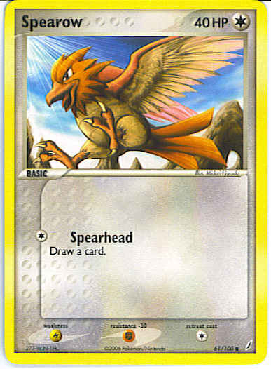 | Type | Colorless | | Pokemon serie | Crystal Guardians | | Stadie | Basic | | HP | 40 | | Sjældenhed | Common | | Tilbagetrækning | 1 | | Modstand | F | | Svaghed | L | | Kortnummer | 61 | | Evne | [C] Spearhead - Draw a card. | | Evne2 | [C] Spearhead - Draw a card. | | Kunstner | Midori Harada |