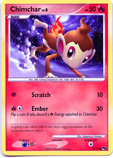 | Type | Fire | | Pokemon serie | OP Series 8 | | Stadie | Basic | | HP | 50.0 | | Sjældenhed | Common | | Tilbagetrækning | 1.0 | | Svaghed | W+10 | | Kortnummer | 12 | | Evne | [0] Scratch (10) [CR] Ember (30) Flip a coin. If tails, discard a R Energy attached to Chimchar.