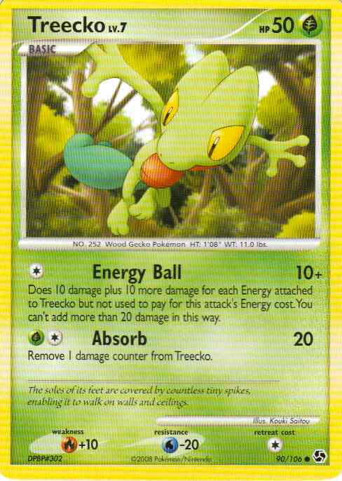 [C] Energy Ball (10+) Does 10 damage plus 10 more damage for each Energy attached to Treecko but not used to pay for this attack's Energy cost. You can't add more than 20 damage in this way.