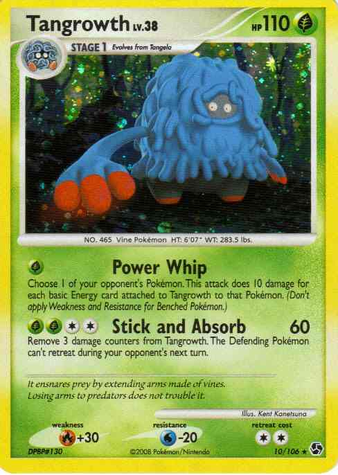 [G] Power Whip - Choose 1 of your opponent's Pokemon. This attack does 10 damage for each basic Energy card attached to Tangrowth to that Pokemon. (Don't apply Weakness and Resistance for Benched Pokemon.