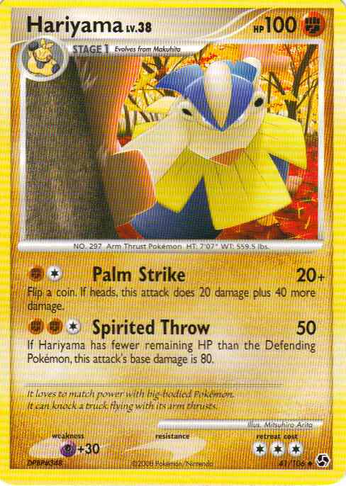 | Type | Fighting | | Pokemon serie | Great Encounters | | Stadie | Stage 1 | | HP | 100.0 | | Sjældenhed | Uncommon | | Tilbagetrækning | 3.0 | | Svaghed | P+30 | | Kortnummer | 41 | | Evne | [CF] Palm Strike (20+) Flip a coin. If heads, this attack does 20 damage plus 40 more damage. [CFF] Spirited Throw (50) If Hariyama has fewer remaining HP than the Defending Pokemon, this attack's base damage is 80.