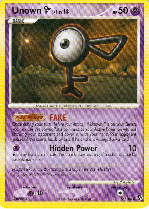 | Type | Psychic | | Pokemon serie | Great Encounters | | Stadie | Basic | | HP | 50.0 | | Sjældenhed | Uncommon | | Tilbagetrækning | 1.0 | | Svaghed | P+10 | | Kortnummer | 56 | | Evne | [P] Hidden Power (10) You may flip a coin. If tails, this attack does nothing. If heads, this attack's base damage is 30.
