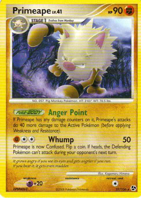 | Type | Fighting | | Pokemon serie | Great Encounters | | Stadie | Stage 1 | | HP | 90.0 | | Sjældenhed | Rare | | Tilbagetrækning | 1.0 | | Svaghed | P+20 | | Kortnummer | 27 | | Evne | [CCF] Whump (50) Primeape is now Confused. Flip a coin. If heads, the Defending Pokemon can't attack during your opponent's next turn.