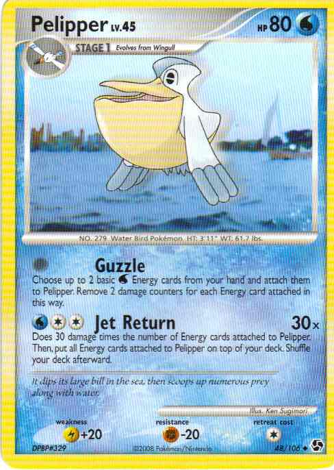 | Type | Water | | Pokemon serie | Great Encounters | | Stadie | Stage 1 | | HP | 80.0 | | Sjældenhed | Uncommon | | Tilbagetrækning | 1.0 | | Modstand | F-20 | | Svaghed | L+20 | | Kortnummer | 48 | | Evne | [0] Guzzle - Choose up to 2 basic W Energy cards from your hand and attach them to Pelipper. Remove 2 damage counters for each Energy card attached in this way. [CCW] Jet Return (30x) Does 30 damage times the number of Energy cards attached to Pelipper. Then, put all Energy cards attached to Pelipper on top of your deck. Shuffle your deck afterward.