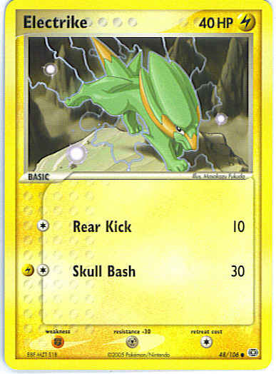 | Type | Lightning | | Pokemon serie | Emerald | | Stadie | Basic | | HP | 40 | | Sjældenhed | Common | | Tilbagetrækning | 1 | | Modstand | M | | Svaghed | F | | Kortnummer | 48 | | Evne | [C] Rear Kick (10) [CL] Skull Bash (30) | | Evne2 | [C] Rear Kick (10) [CL] Skull Bash (30) | | Kunstner | Masakazu Fukuda |