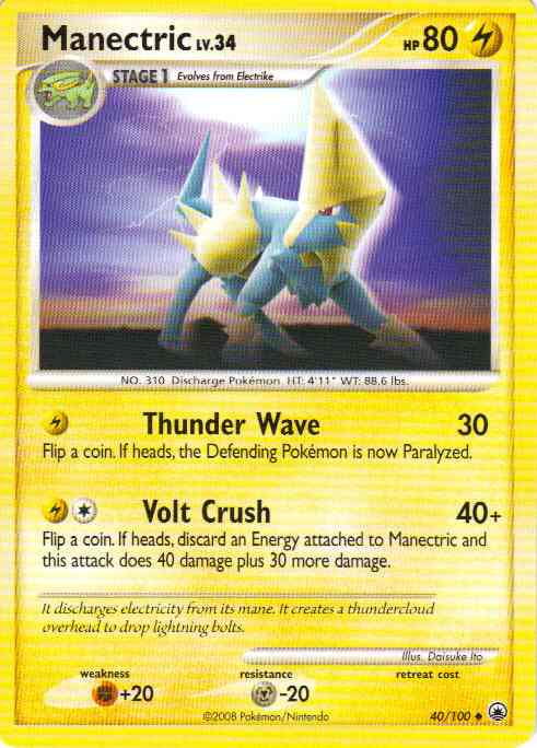 | Type | Lightning | | Pokemon serie | Majestic Dawn | | Stadie | Stage 1 | | HP | 80.0 | | Sjældenhed | Uncommon | | Tilbagetrækning | 0.0 | | Modstand | M-20 | | Svaghed | F+20 | | Kortnummer | 40 | | Evne | [L] Thunder Wave (30) Flip a coin. If heads, the Defending Pokemon is now Paralyzed. [CL] Volt Crush (40+) Flip a coin. If heads, discard an Energy attached to Manectric and this attack does 40 damage plus 30 more damage.