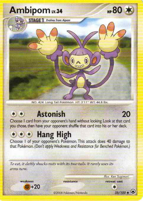 | Type | Colorless | | Pokemon serie | Majestic Dawn | | Stadie | Stage 1 | | HP | 80.0 | | Sjældenhed | Uncommon | | Tilbagetrækning | 1.0 | | Svaghed | F+20 | | Kortnummer | 35 | | Evne | [CC] Astonish (20) Choose 1 card from your opponent's hand without looking. Look at that card you chose, then have your opponent shuffle that card into his or her deck. [CCC] Hang High - Choose 1 of your opponent's Pokemon. This attack does 40 damage to that Pokemon. (Don't apply Weakness and Resistance for Benched Pokemon.)