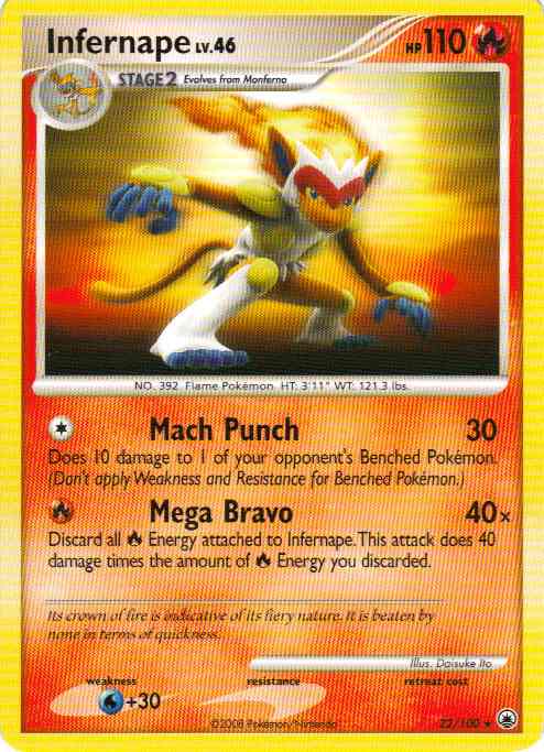 [R] Mega Bravo (40x) Discard all R Energy attached to Infernape. This attack does 40 damage times the amount of R Energy you discarded.