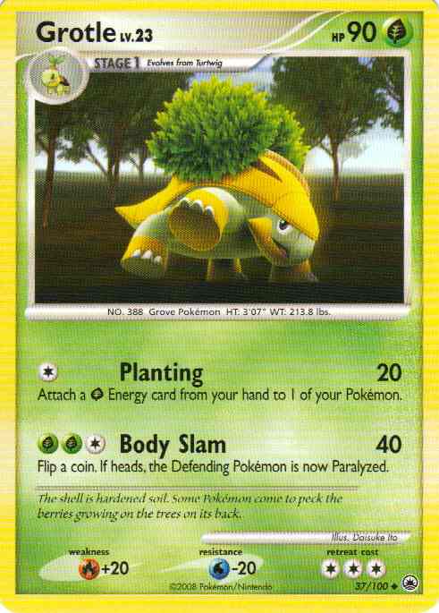 | Type | Grass | | Pokemon serie | Majestic Dawn | | Stadie | Stage 1 | | HP | 90.0 | | Sjældenhed | Uncommon | | Tilbagetrækning | 3.0 | | Modstand | W-20 | | Svaghed | R+20 | | Kortnummer | 37 | | Evne | [C] Planting (20) Attach a G Energy card from your hand to 1 of your Pokemon. [CGG] Body Slam (40) Flip a coin. If heads, the Defending Pokemon is now Paralyzed.