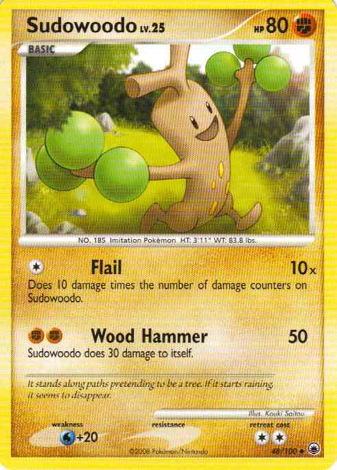 | Type | Fighting | | Pokemon serie | Majestic Dawn | | Stadie | Basic | | HP | 80.0 | | Sjældenhed | Uncommon | | Tilbagetrækning | 2.0 | | Svaghed | W+20 | | Kortnummer | 48 | | Evne | [C] Flail (10x) Does 10 damage times the number of damage counters on Sudowoodo. [FF] Wood Hammer (50) Sudowoodo does 30 damage to itself.
