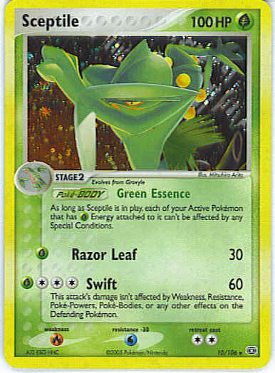 | Type | Grass | | Pokemon serie | Emerald | | Stadie | Stage 2 | | HP | 100 | | Sjældenhed | Rare | | Tilbagetrækning | 2 | | Modstand | W | | Svaghed | R | | Kortnummer | 10 | | Evne |