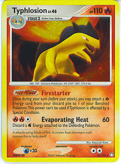| Type | Fire | | Pokemon serie | Mysterious Treasures | | Stadie | Stage 2 | | HP | 110 | | Sjældenhed | Rare | | Tilbagetrækning | 2 | | Svaghed | W+30 | | Kortnummer | 16 | | Evne |