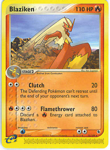 | | Evne2 | [CC] Clutch (20) The Defending Pokemon can't retreat until the end of your opponent's next turn. [CCCR] Flamethrower (80) Discard a R Energy card attached to Blaziken.