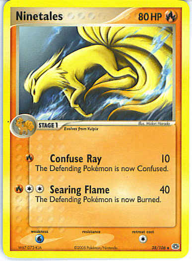 | Type | Fire | | Pokemon serie | Emerald | | Stadie | Stage 1 | | HP | 80 | | Sjældenhed | Uncommon | | Tilbagetrækning | 1 | | Svaghed | W | | Kortnummer | 38 | | Evne | [R] Confuse Ray (10) The Defending Pokemon is now Confused. [CCR] Searing Flame (40) The Defending Pokemon is now Burned. | | Evne2 | [R] Confuse Ray (10) The Defending Pokemon is now Confused. [CCR] Searing Flame (40) The Defending Pokemon is now Burned. | | Kunstner | Midori Harada |