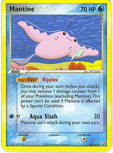 | Type | Water | | Pokemon serie | Team Rocket Returns | | Stadie | Basic | | HP | 70 | | Sjældenhed | Uncommon | | Tilbagetrækning | 1 | | Svaghed | L | | Kortnummer | 45 | | Evne | [CW] Aqua Slash (30) Mantine can't attack during your next turn. | | Evne2 | [CW] Aqua Slash (30) Mantine can't attack during your next turn. | | Kunstner | Miki Tanaka |