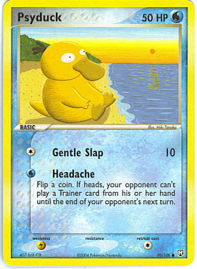 | Type | Water | | Pokemon serie | Team Rocket Returns | | Stadie | Basic | | HP | 50 | | Sjældenhed | Common | | Tilbagetrækning | 1 | | Svaghed | L | | Kortnummer | 70 | | Evne | [C] Gentle Slap (10) [W] Headache - Flip a coin. If heads, your opponent can't play a Trainer card from his or her hand until the end of your opponent's next turn. | | Evne2 | [C] Gentle Slap (10) [W] Headache - Flip a coin. If heads, your opponent can't play a Trainer card from his or her hand until the end of your opponent's next turn. | | Kunstner | Miki Tanaka |