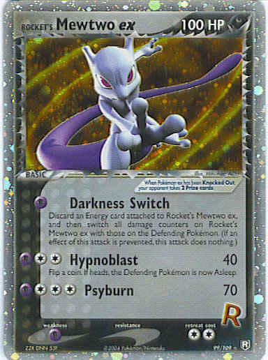 | Type | Darkness | | Pokemon serie | Team Rocket Returns | | Stadie | Basic | | HP | 100 | | Sjældenhed | Ultra-Rare | | Tilbagetrækning | 2 | | Svaghed | P | | Kortnummer | 99 | | Evne | [P] Darkness Switch - Discard an Energy card attached to Rocket's Mewtwo ex, and then switch all damage counters on Rocket's Mewtwo ex with those on the Defending Pokemon. (If an effect of this attack is prevents, this attack does nothing.) [CCP] Hypnoblast (40) Flip a coin. If heads, the Defending Pokemon is now Asleep. [CCCP] Psyburn (70) | | Evne2 | [P] Darkness Switch - Discard an Energy card attached to Rocket's Mewtwo ex, and then switch all damage counters on Rocket's Mewtwo ex with those on the Defending Pokemon. (If an effect of this attack is prevents, this attack does nothing.) [CCP] Hypnoblast (40) Flip a coin. If heads, the Defending Pokemon is now Asleep. [CCCP] Psyburn (70) | | Kunstner | Mitsuhiro Arita |